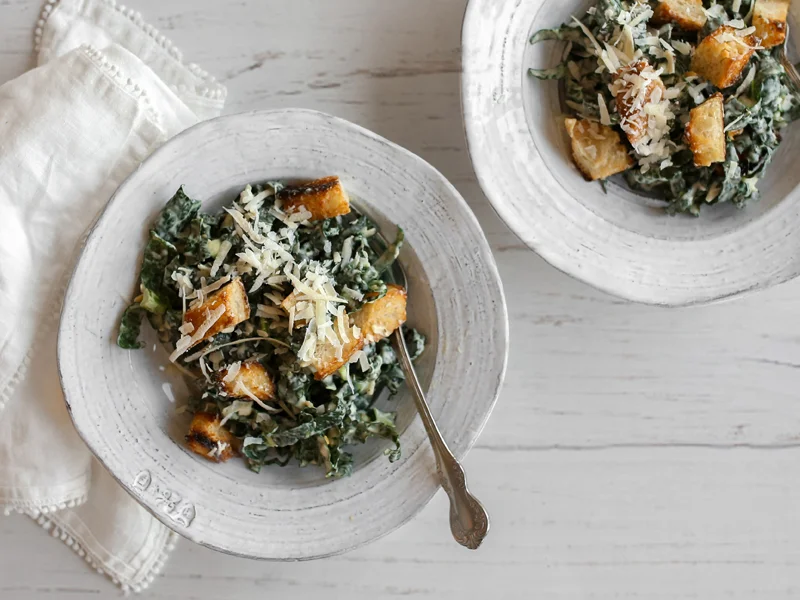 Add the dressing to the kale, once they've been properly combined add the croutons and toss. Sprinkle a little more parmesan cheese on top, toss and serve.