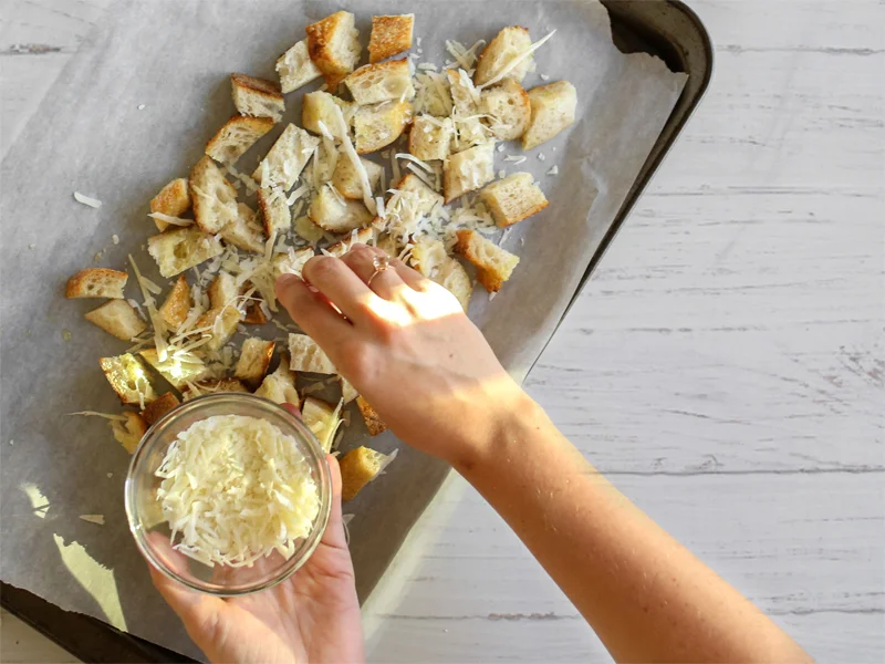 Cut the crostini bread into cubes until there is about 2 cups. Toss the cubed bread into a medium sized mixing bowl and toss with avocado oil and minced garlic. Transfer the mixture to the baking sheet and sprinkle the freshly grated parmesan cheese on top.
