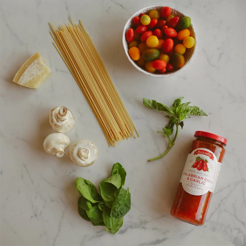While the pasta is boiling and the sauce is heating add one tbsp of avocado oil to a hot sauce pan. Once the oil is hot, add the mushrooms and garlic and stir occasionally. Once the mushrooms are nicely browned add the halved cherry tomatoes. Heat the mushroom and tomato mixture for another minute or two or until the tomatoes are warm but not mushy. Remove the mixture from heat and set aside.