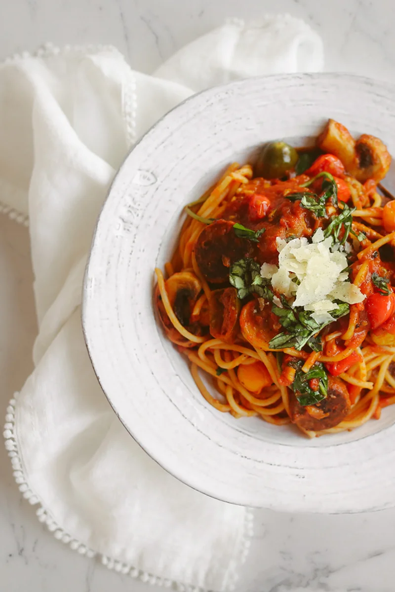 Add the mushroom mixture and sausages to the tomato sauce along with the spinach and olives. When the spinach is wilted add the cook pasta, toss. Spoon the pasta into two bowls and top with sliced basil and parmesan cheese.