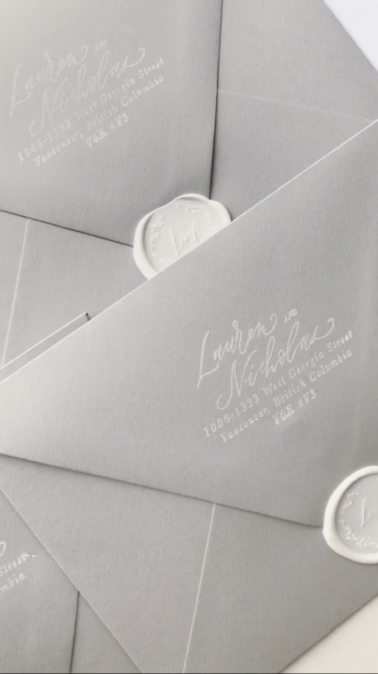 As for the colour palette, we went with white handmade paper, dove grey envelopes, a creamy tan silk and creamy white wax seal stamp.